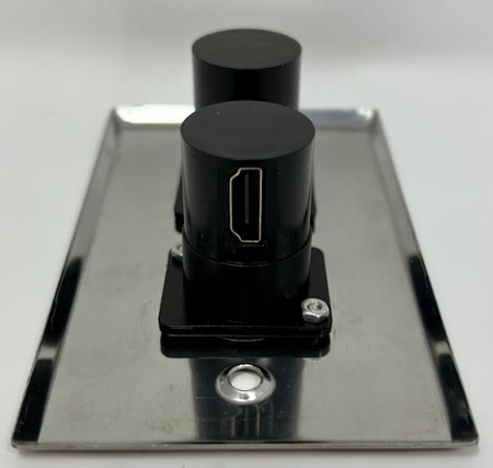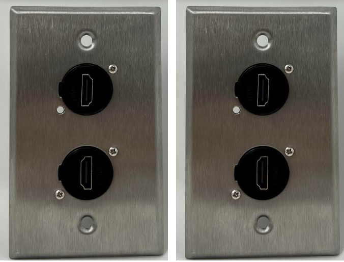 RiteAV's 2 Port HDMI D Series Heavy Duty Pass Through Solderless Stainless Steel Wall Plate is configured with D Series Chassis Panel Mount Couplers which are durably constructed to withstand wear and tear in residential applications as well as in commercial settings like offices, hotels, dormitories and airports. This discreet solution enables you to route your cabling through the walls and results in a clean, professional look behind wall mounted televisions, monitors, projectors and entertainment centers in both residential (home theater) and commercial (classroom, boardroom, factory floor, recording studio, auditorium, concert hall and theater etc.) settings. The feed through design enables pre-terminated cables to plug into both sides of the coupler the same way. No soldering or additional tools are required; just plug and play. The single body robust design of the couplers provides a reliable, stable connection for residential, industrial and commercial-grade audio, video and network connections. Mounting screws are included.