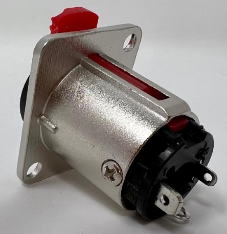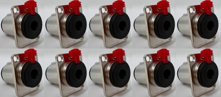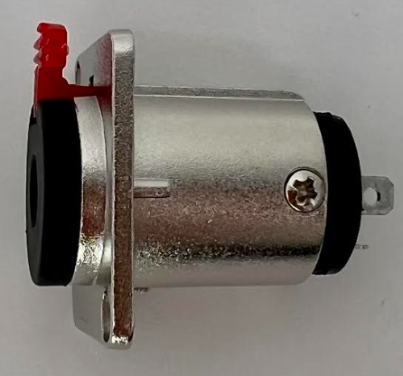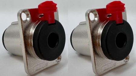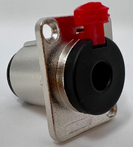 This particular D Series Coupler has silver metal housing (alternate colors are available) and accepts a 6.35mm Male terminated cable on the front side and solder cup contact termination on the backside. The contacts must be soldered on the backside of the coupler. The input on the front side is expertly crafted to ensure that a 6.35mm Cable fits securely into place and can be disconnected using the integrated push lock release mechanism.