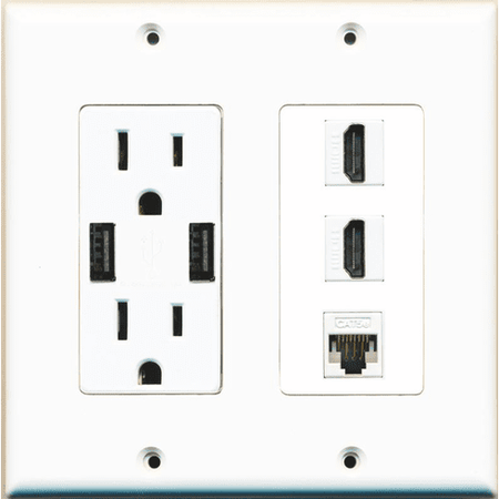 RiteAV 15 Amp 125V Power Outlet (2 USB Charger Receptacle) 2 Hdmi Cat5e Wall Plate White