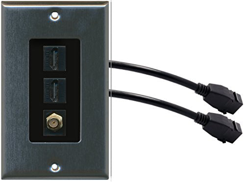 RiteAV (1 Gang Decorative) 2 HDMI Black Coax Wall Plate w/ Pigtail Extension Cable Stainless (Black Insert)