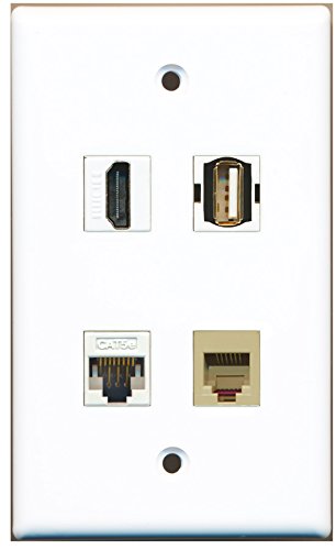 RiteAV - 1 Port HDMI 1 Port USB A-A 1 Port Phone RJ11 RJ12 Beige 1 Port Cat5e Ethernet White Wall Plate