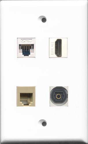 RiteAV - 1 Port HDMI and 1 Port Phone RJ11 RJ12 Beige and 1 Port Toslink and 1 Port Cat5e Ethernet White Wall Plate