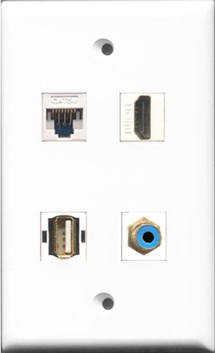 RiteAV 1 Port HDMI and 1 Port RCA Blue and 1 Port USB A-A and 1 Port Cat5e Ethernet White Wall Plate