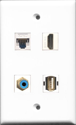 RiteAV - 1 Port HDMI and 1 Port RCA Blue and 1 Port USB A-A and 1 Port Cat5e Ethernet White Wall Plate