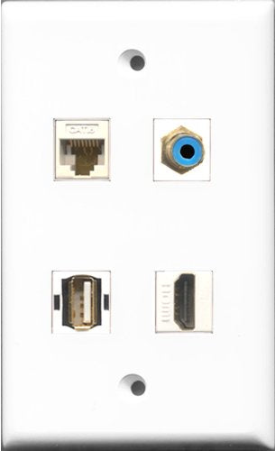 RiteAV 1 Port HDMI and 1 Port RCA Blue and 1 Port USB A-A and 1 Port Cat6 Ethernet White Wall Plate