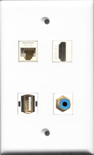 RiteAV 1 Port HDMI and 1 Port RCA Blue and 1 Port USB A-A and 1 Port Cat6 Ethernet White Wall Plate