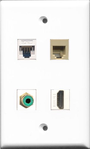 RiteAV 1 Port HDMI and 1 Port RCA Green and 1 Port Phone RJ11 RJ12 Beige and 1 Port Cat5e Ethernet White Wall Plate