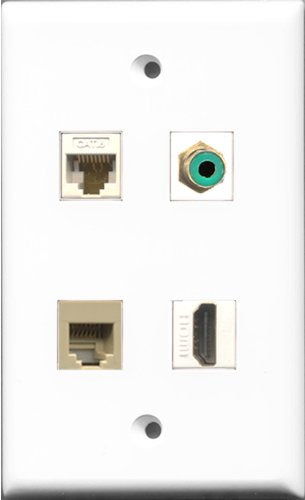 RiteAV 1 Port HDMI and 1 Port RCA Green and 1 Port Phone RJ11 RJ12 Beige and 1 Port Cat6 Ethernet White Wall Plate