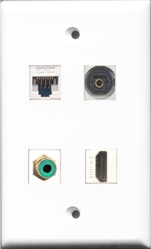 RiteAV 1 Port HDMI and 1 Port RCA Green and 1 Port Toslink and 1 Port Cat5e Ethernet White Wall Plate