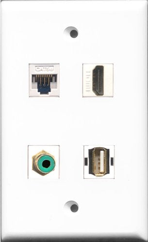 RiteAV - 1 Port HDMI and 1 Port RCA Green and 1 Port USB A-A and 1 Port Cat5e Ethernet White Wall Plate