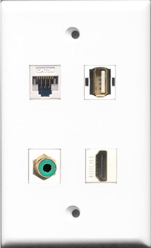 RiteAV 1 Port HDMI and 1 Port RCA Green and 1 Port USB A-A and 1 Port Cat5e Ethernet White Wall Plate