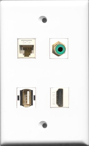 RiteAV 1 Port HDMI and 1 Port RCA Green and 1 Port USB A-A and 1 Port Cat6 Ethernet White Wall Plate