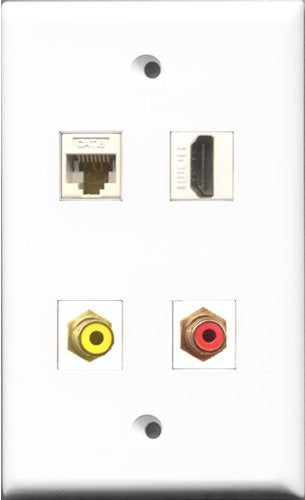 RiteAV 1 Port HDMI and 1 Port RCA Red and 1 Port RCA Yellow and 1 Port Cat6 Ethernet White Wall Plate
