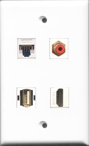 RiteAV 1 Port HDMI and 1 Port RCA Red and 1 Port USB A-A and 1 Port Cat5e Ethernet White Wall Plate