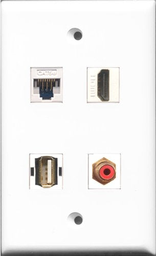 RiteAV 1 Port HDMI and 1 Port RCA Red and 1 Port USB A-A and 1 Port Cat5e Ethernet White Wall Plate