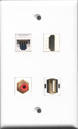 RiteAV - 1 Port HDMI and 1 Port RCA Red and 1 Port USB A-A and 1 Port Cat5e Ethernet White Wall Plate