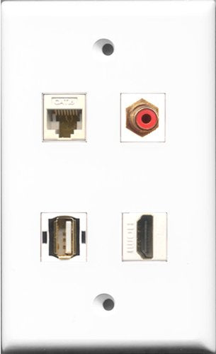 RiteAV 1 Port HDMI and 1 Port RCA Red and 1 Port USB A-A and 1 Port Cat6 Ethernet White Wall Plate