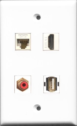 RiteAV 1 Port HDMI and 1 Port RCA Red and 1 Port USB A-A and 1 Port Cat6 Ethernet White Wall Plate