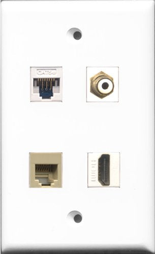 RiteAV 1 Port HDMI and 1 Port RCA White and 1 Port Phone RJ11 RJ12 Beige and 1 Port Cat5e Ethernet White Wall Plate