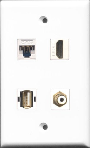 RiteAV 1 Port HDMI and 1 Port RCA White and 1 Port USB A-A and 1 Port Cat5e Ethernet White Wall Plate
