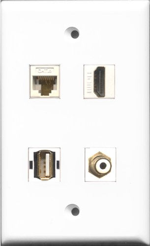 RiteAV 1 Port HDMI and 1 Port RCA White and 1 Port USB A-A and 1 Port Cat6 Ethernet White Wall Plate