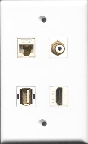 RiteAV 1 Port HDMI and 1 Port RCA White and 1 Port USB A-A and 1 Port Cat6 Ethernet White Wall Plate