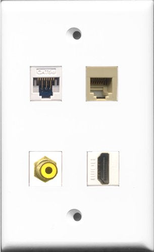 RiteAV 1 Port HDMI and 1 Port RCA Yellow and 1 Port Phone RJ11 RJ12 Beige and 1 Port Cat5e Ethernet White Wall Plate