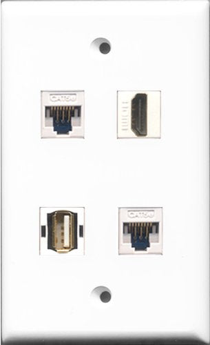 RiteAV 1 Port HDMI and 1 Port USB A-A 2 Port Cat5e Ethernet White Wall Plate