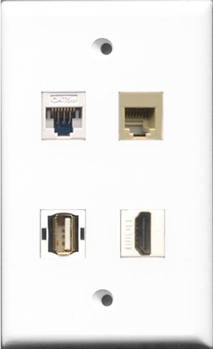RiteAV 1 Port HDMI and 1 Port USB A-A and 1 Port Phone RJ11 RJ12 Beige and 1 Port Cat5e Ethernet White Wall Plate