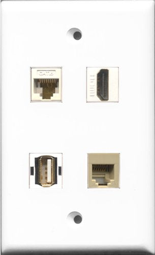 RiteAV 1 Port HDMI and 1 Port USB A-A and 1 Port Phone RJ11 RJ12 Beige and 1 Port Cat6 Ethernet White Wall Plate