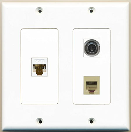 RiteAV - 1 Port Phone RJ11 RJ12 Beige 1 Port 3.5mm 1 Port Cat6 Ethernet White - 2 Gang Wall Plate