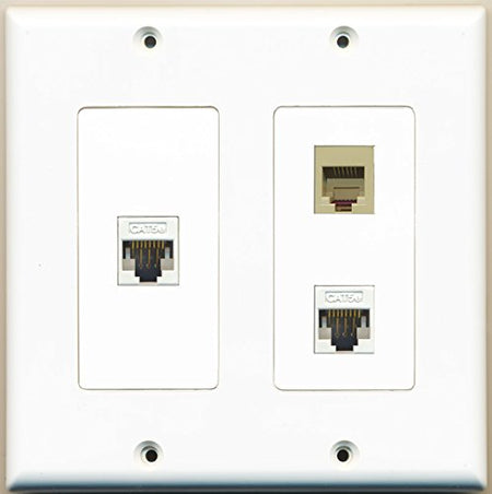 RiteAV - 1 Port Phone RJ11 RJ12 Beige 2 Port Cat5e Ethernet White - 2 Gang Wall Plate