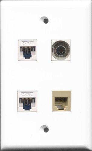 RiteAV - 1 Port Phone RJ11 RJ12 Beige and 1 Port 3.5mm 2 Port Cat5e Ethernet White Wall Plate