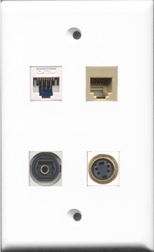 RiteAV 1 Port Phone RJ11 RJ12 Beige and 1 Port S-Video and 1 Port Toslink and 1 Port Cat5e Ethernet White Wall Plate