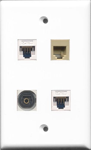 RiteAV 1 Port Phone RJ11 RJ12 Beige and 1 Port Toslink 2 Port Cat5e Ethernet White Wall Plate