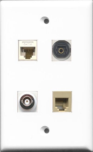 RiteAV 1 Port Phone RJ11 RJ12 Beige and 1 Port Toslink and 1 Port BNC and 1 Port Cat6 Ethernet White Wall Plate