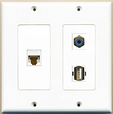 RiteAV - 1 Port RCA Blue 1 Port USB A-A 1 Port Cat6 Ethernet White - 2 Gang Wall Plate