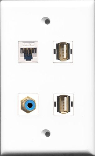 RiteAV 1 Port RCA Blue 2 Port USB A-A and 1 Port Cat5e Ethernet White Wall Plate