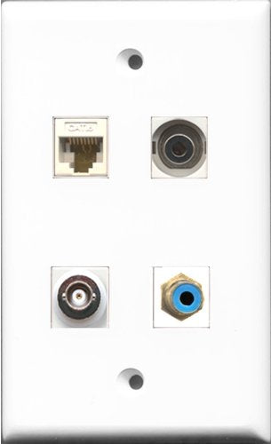 RiteAV 1 Port RCA Blue and 1 Port 3.5mm and 1 Port BNC and 1 Port Cat6 Ethernet White Wall Plate