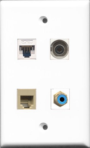 RiteAV - 1 Port RCA Blue and 1 Port Phone RJ11 RJ12 Beige and 1 Port 3.5mm and 1 Port Cat5e Ethernet White Wall Plate