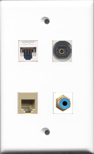 RiteAV - and 1 Port RCA Blue and 1 Port Phone RJ11 RJ12 Beige and 1 Port Toslink Digital Audio and 1 Port Cat5e Ethernet White Wall Plate
