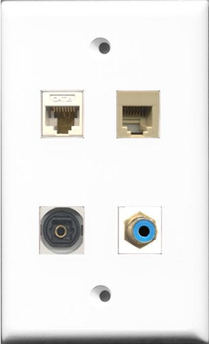 RiteAV - and 1 Port RCA Blue and 1 Port Phone RJ11 RJ12 Beige and 1 Port Toslink Digital Audio and 1 Port Cat6 Ethernet White Wall Plate