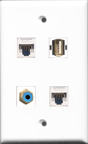 RiteAV 1 Port RCA Blue and 1 Port USB A-A 2 Port Cat5e Ethernet White Wall Plate
