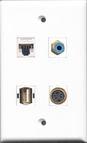 RiteAV 1 Port RCA Blue and 1 Port USB A-A and 1 Port S-Video and 1 Port Cat5e Ethernet White Wall Plate