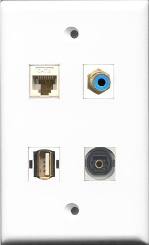 RiteAV 1 Port RCA Blue and 1 Port USB A-A and 1 Port Toslink and 1 Port Cat6 Ethernet White Wall Plate