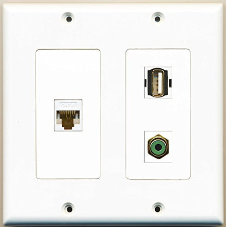 RiteAV - 1 Port RCA Green 1 Port USB A-A 1 Port Cat6 Ethernet White - 2 Gang Wall Plate