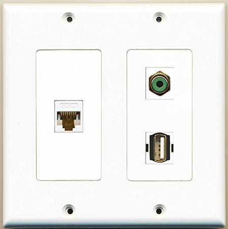 RiteAV - 1 Port RCA Green 1 Port USB A-A F/F 1 Port Cat6 Ethernet White - 2 Gang Wall Plate