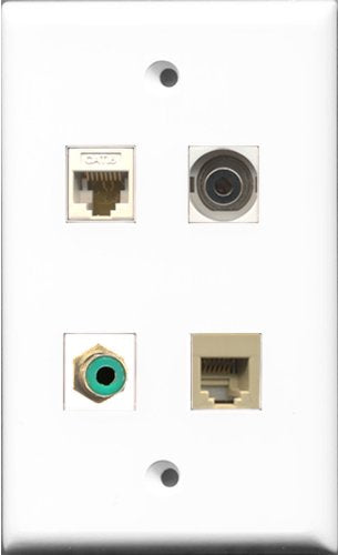 RiteAV - and 1 Port RCA Green and 1 Port Phone RJ11 RJ12 Beige and 1 Port 3.5mm and 1 Port Cat6 Ethernet White Wall Plate