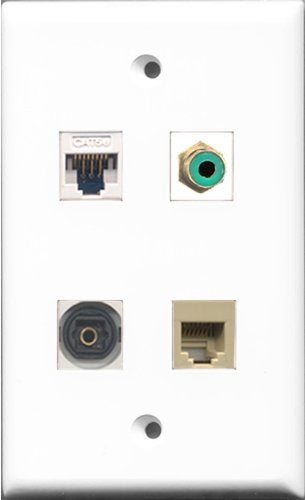 RiteAV - and 1 Port RCA Green and 1 Port Phone RJ11 RJ12 Beige and 1 Port Toslink Digital Audio and 1 Port Cat5e Ethernet White Wall Plate