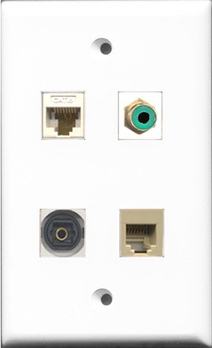 RiteAV - and 1 Port RCA Green and 1 Port Phone RJ11 RJ12 Beige and 1 Port Toslink Digital Audio and 1 Port Cat6 Ethernet White Wall Plate